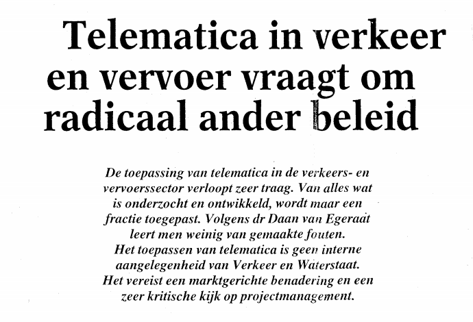 Dissertatie van Daan van Egeraat. De Implementatie van telematica in de verkeer – en vervoersector als inter-organisatorisch veranderingsproces, proefschrift, D.H. van Egeraat, verdedigd op 18 juni 1998.
