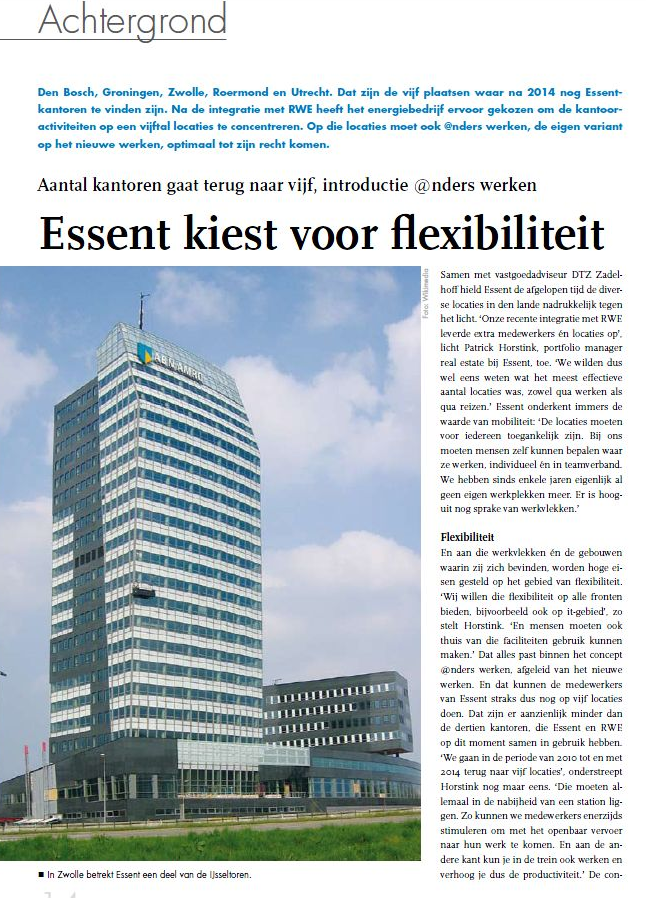 Interview met Patrick Horstink, Portfolio Manager Real Estate bij Essent, die is geadviseerd door DTZ Zadelhoff en Montefeltro rond een aantal scenario’s die in het teken staan van ‘@nders werken’ bij Essent. Optimalisering vond plaats langs 4 lijnen: Work-Life Balance, Duurzaamheid, Mobiliteit en Bereikbaarheid, en Kostenreductie.