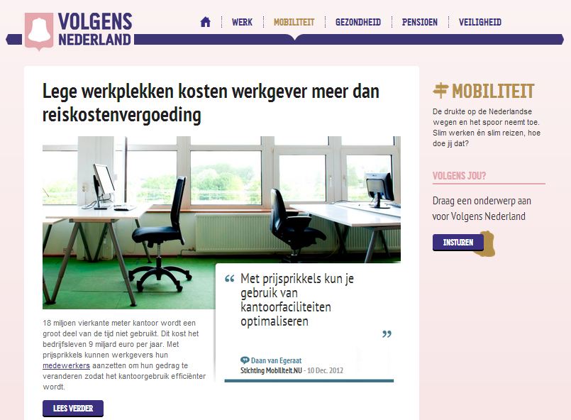 VolgensNederland.nl besteedt aandacht aan de analyse van Daan van Egeraat rond leegstaande werkplekken en beloningsmodellen. ’18 miljoen vierkante meter kantoor wordt een groot deel van de tijd niet gebruikt. Dit kost het bedrijfsleven 9 miljard euro per jaar. Met prijsprikkels kunnen werkgevers hun medewerkers aanzetten om hun gedrag te veranderen zodat het kantoorgebruik efficiënter wordt.’ Lees 12 12 11 van DvE leegstaande werkplekken volgensnl hier.