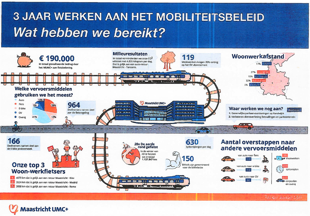De nieuwste Infographic van MUMC+/azM is uit. Het toont dat het effect op gedrag van de medewerkers van het beleid dat in 2015 werd ingevoerd duurzaam is. Wanneer prijsprikkels permanent zijn (en niet tijdelijk, zoals bij pilots, of Spitsmijden projecten) zal de gedragsaanpassing ook blijven. Dit kan omdat MUMC+ dit beleid met een eigen businesscase, los van overheidssubsidie, heeft ingevoerd. Ook in 2017 en 2016 publiceerde MUMC+ Infographics. Montefeltro verzorgt de uitvoering van het beleid bij MUMC+.