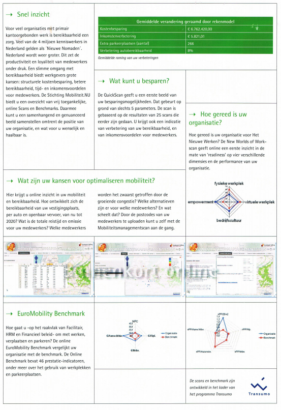 De gemiddelde netto inkomensverbetering voor de medewerkers ligt op 19%. Bij gemiddeld 3½ uur reistijd/week, betekent dit voor de medewerker een reistijdwinst van ruim 1uur/week. Op de gemiddelde Modal Split van 45% is een verbetering mogelijk van gemiddeld 8%. Op 24.500 medewerkers is dit een reductie van 1.980 autobewegingen per dag.